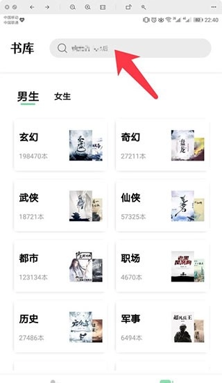 3、进入【书库】后,点击顶部的【搜索栏】开始查找书籍。