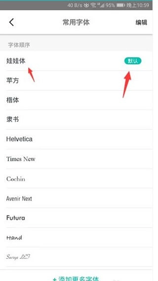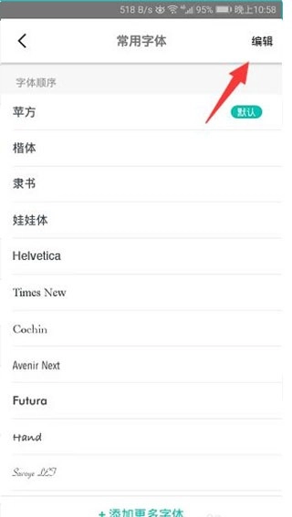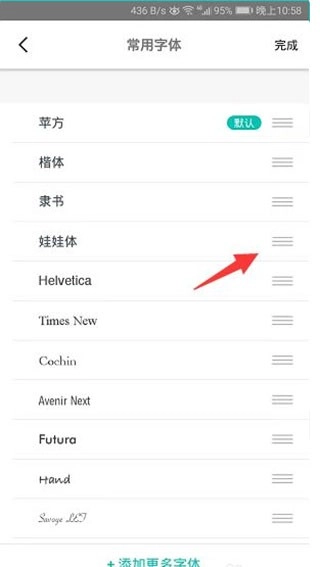 进入编辑状态后,长按喜欢字体后的三横线图标进行拖拽排序。