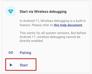 在Shizuku应用内选择“通过无线调试启动”,然后点击“配对”按钮。