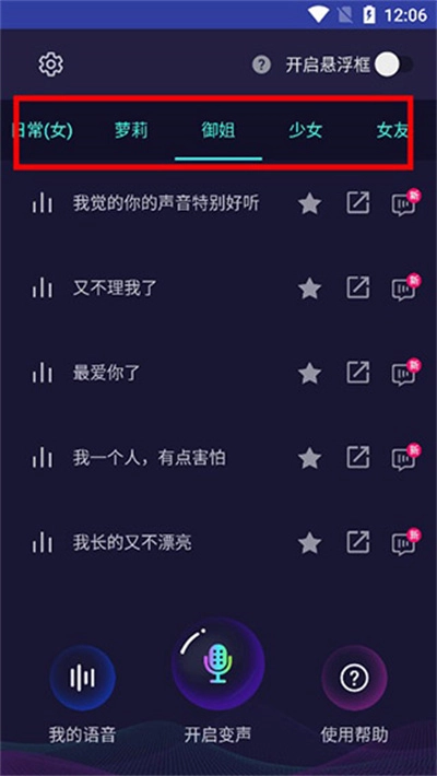 3、来到软件主界面,你可以看到御姐、女孩、女朋友等语音包,你也可以使用自己的语音进行编辑。