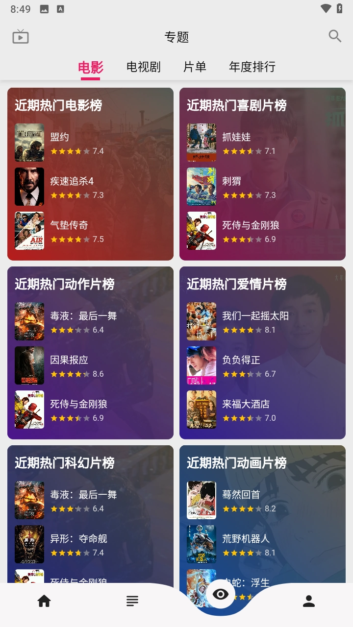 4、此外,软件还设有实时排行榜功能,涵盖电影、电视剧和年度榜单等多种分类。