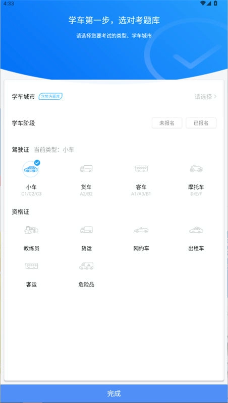 1、打开车轮驾考通,选择自己当前准备报考的驾照类型