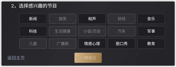 1、初次使用时,只需选择几个感兴趣的节目类别和性别,轻松激活软件,快速进入你的听觉盛宴。