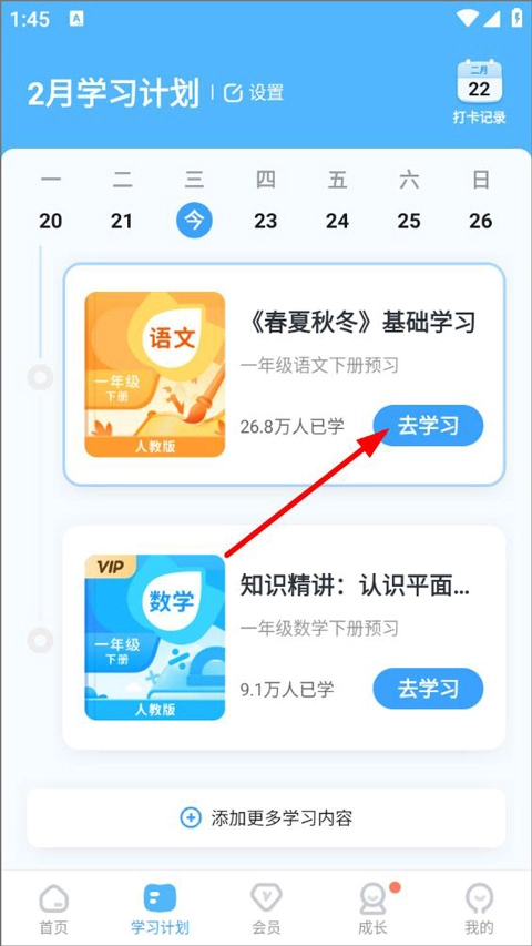 3、打开学习计划页面,用户可查看当天学习计划,点击去学习;