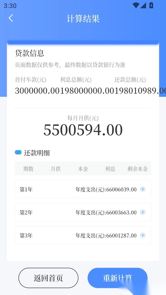4.最后进入“计算结果”菜单界面,就可以获取贷款计算的详情结果了