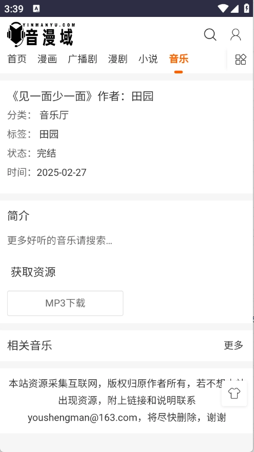音漫域聚合了音乐、小说与漫画等多元资源,清晰的分类体系助力用户迅速定位心仪内容,全方位满足各类用户的资源需求;同时,平台会依据用户的偏好,智能精准地推送同类型资源,让用户能便捷获取所需内容。