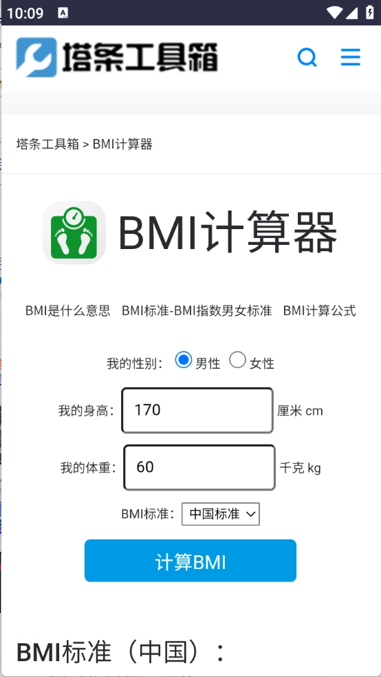 5、用户点开需要的工具,小编点开的是BMI计算器,在输入框输入性别、身高以及体重信息点击计算。