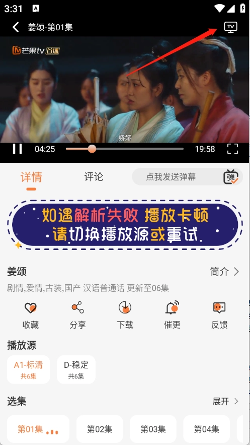 1、选定想看的影视资源后,点击右上角的“TV”按钮。