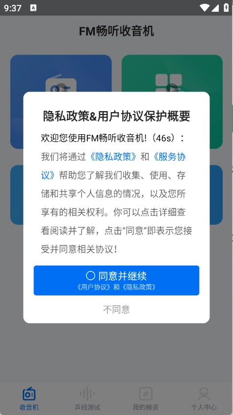 用户在使用好FM畅听收音机前,需查看并同意隐私政策与用户协议。