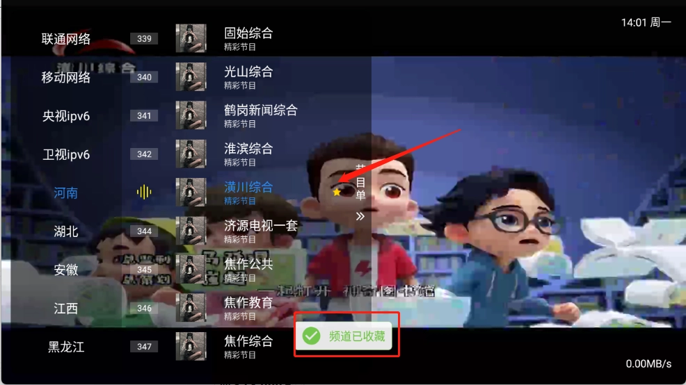 4、长按可以收藏电视频道。