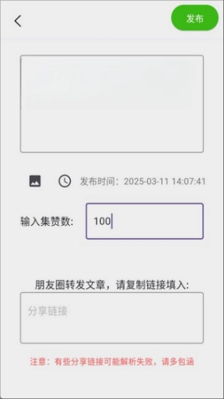 4、在编辑页面中,输入你想要发布的文字内容,并设定集赞的目标数量以及链接(请注意,集赞人数上限为300人,且分享的链接可能存在解析失败的情况)。