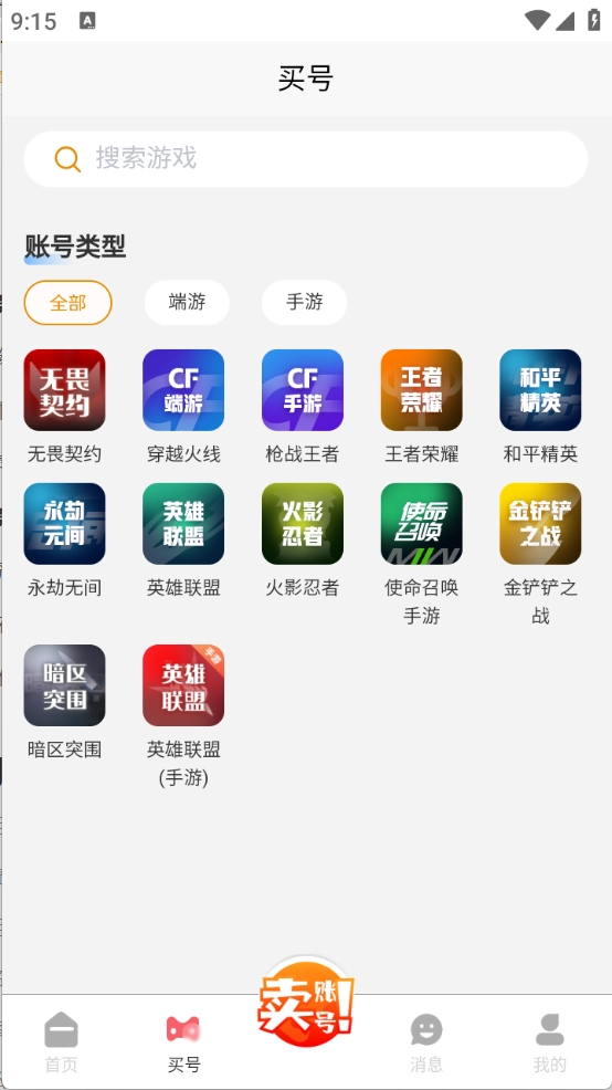 2、选择游戏,找到出售购买帐号所在的游戏图标,点击打开游戏专属客服页面。