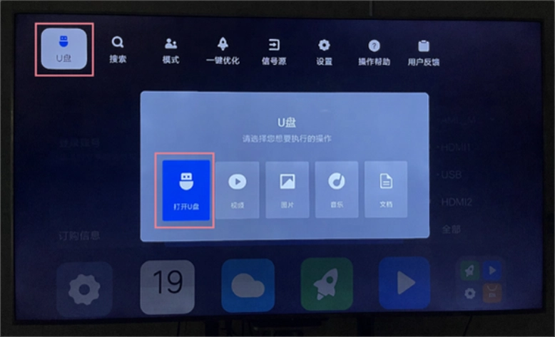 3、将 U 盘插到电视上,在弹窗上选择“打开 U 盘”。如果未弹出,可在电视首页最顶部,按“上”键,找到 U 盘。