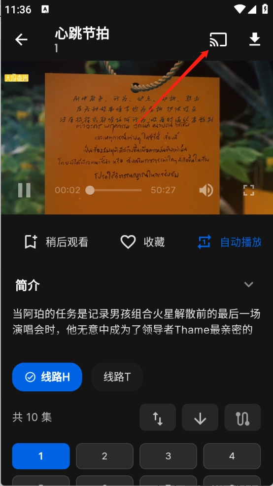 1、打开想要投屏的影视资源进入播放页面,点击右上角的“投屏”。