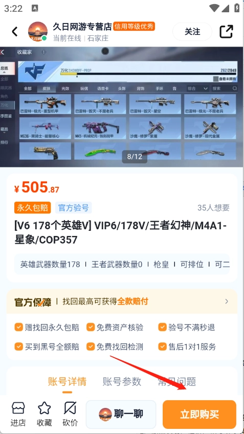 注:针对未购买包赔或包赔过期的账号,若账号发生找回,平台会协助买家追回追款,但追不回的情况下无法获得理赔,建议您挑选带有“永久包赔"的账号。