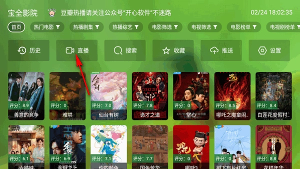 1、启动软件后进入首页,点击顶部的直播入口。