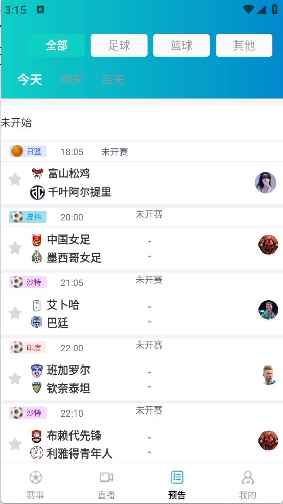 5、“预告”页面,可以查看未开赛的赛事哦。
