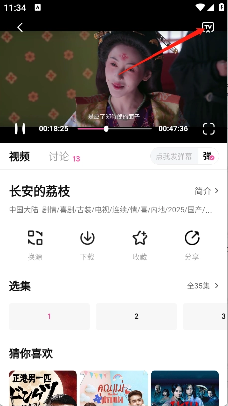 1、打开你想投屏的影视内容,然后点击页面右上角的“TV”图标。