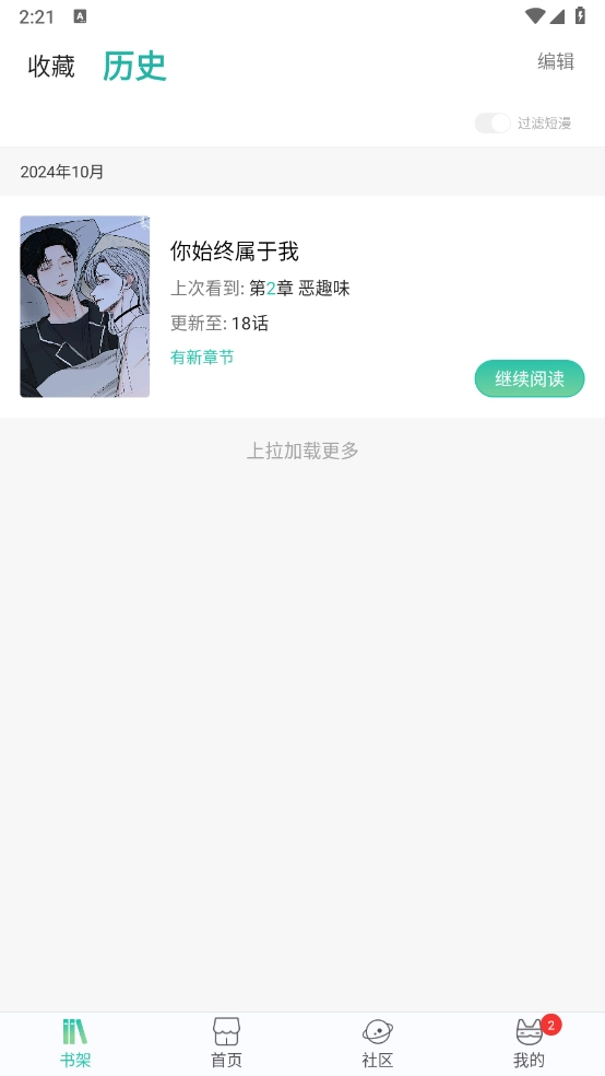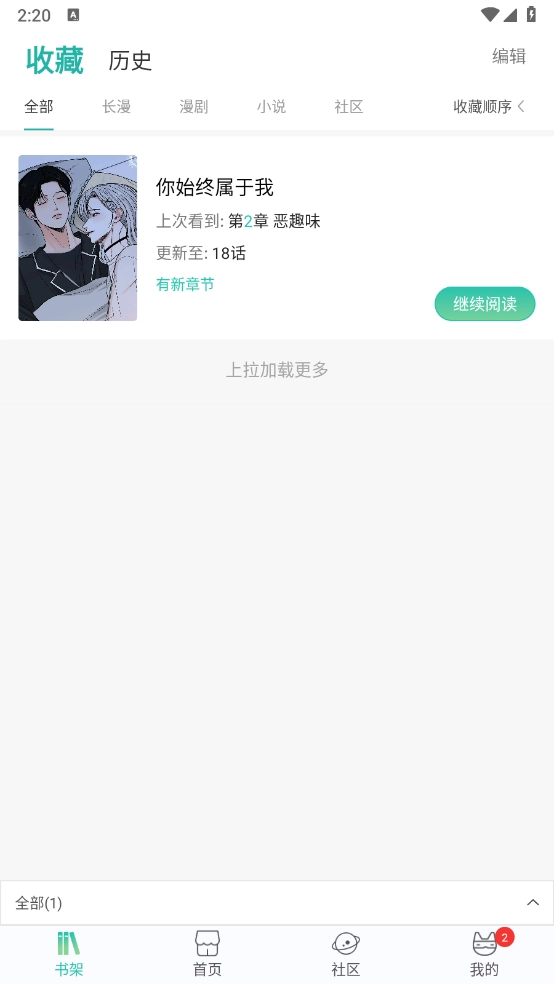 3、收藏之后,点击'书架“就可以看到收藏的漫画了。