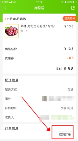 1、第一步打开十荟团,进入个人中心页面,接着进入订单页面,找到需要取消的订单内容;