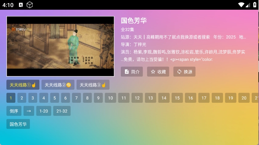 4、点开想看的影视资源,就可以进行播放了,可以将影视进行收藏、、换源等。