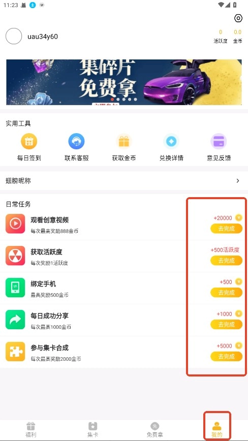 1. 在我的界面完成任务以获取金币