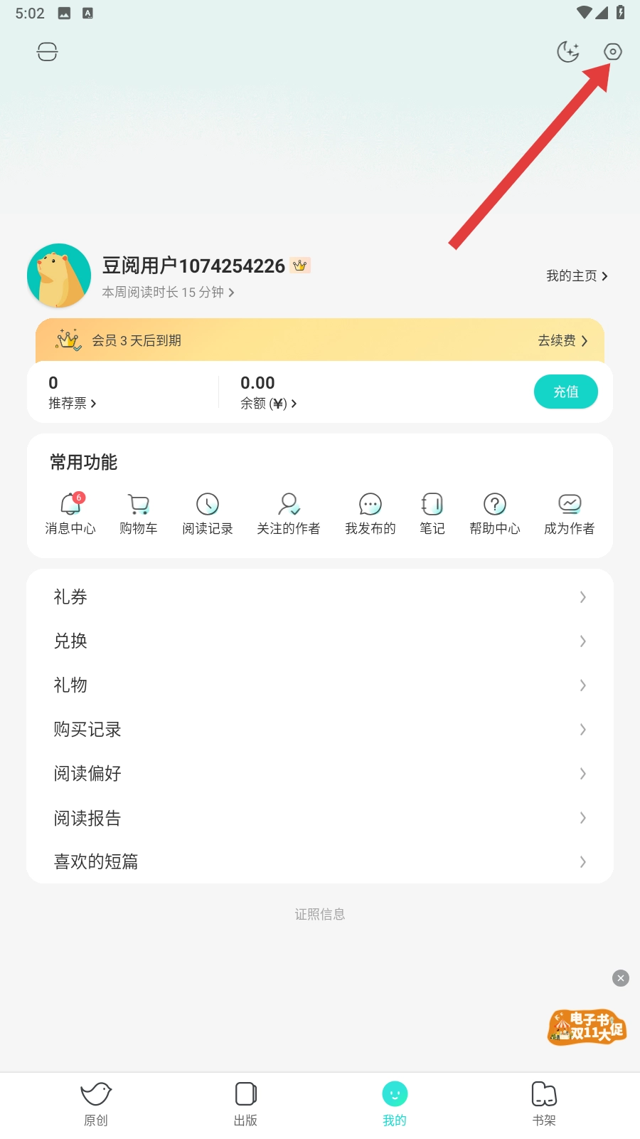 1、先打开【豆瓣阅读】App,接着在【我的】页面找到右上角的设置图标并点击就可以啦。