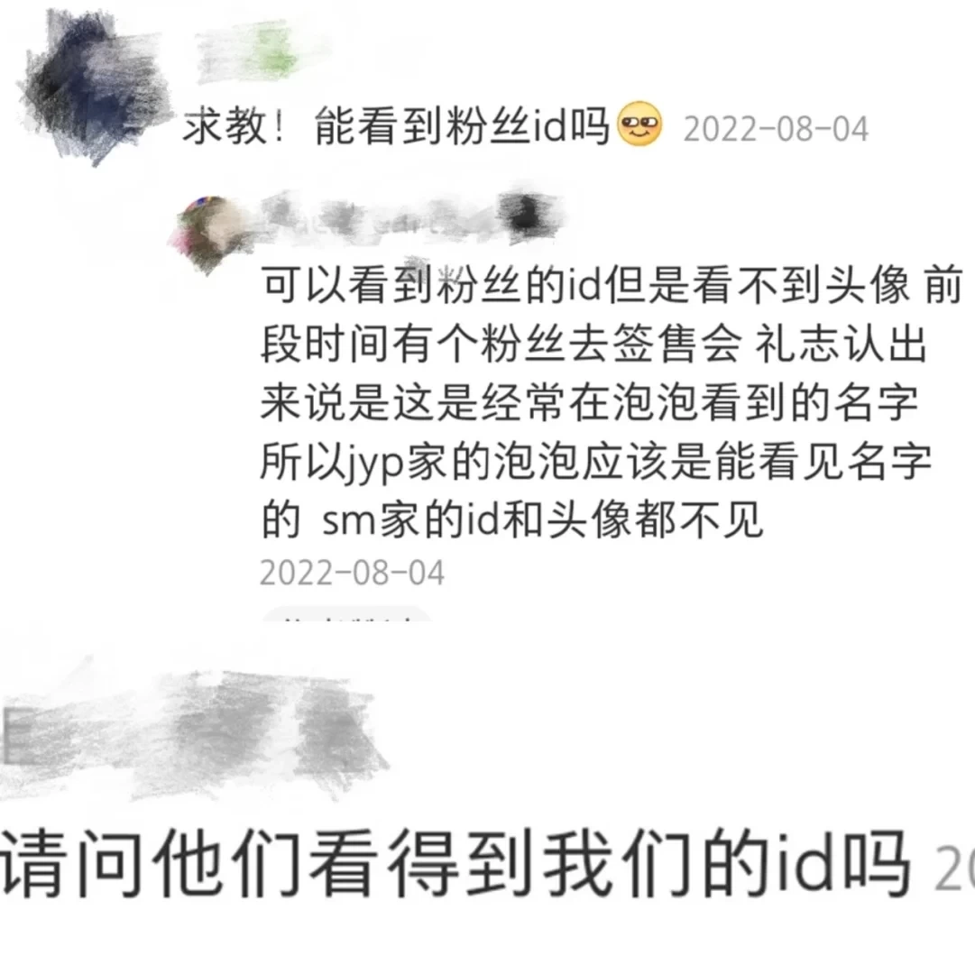 答:有姐妹去签售问了艺人。现已知jyp泡泡可以看到ID,lysn的ID可以看见,头像都不可以看到。