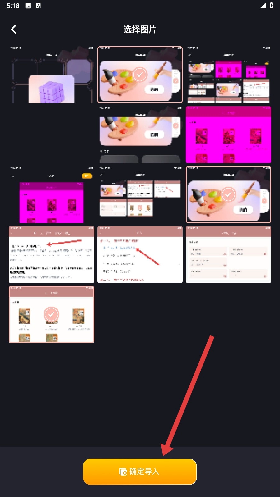 3、进入选择图片页面后,挑选需要拼接的图片,选好后点击底部【确定导入】按钮,导入所选图片。