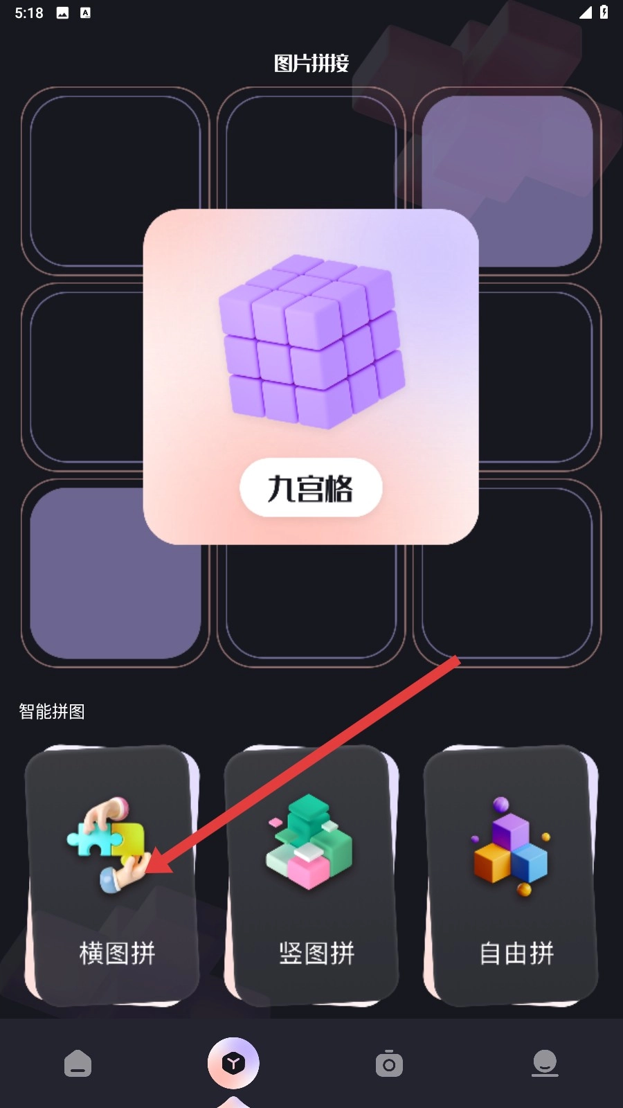 2、在图片拼接页面,能看到【九宫格】等样式,点击【智能拼图-横图拼】,选择横向拼接图片的方式。