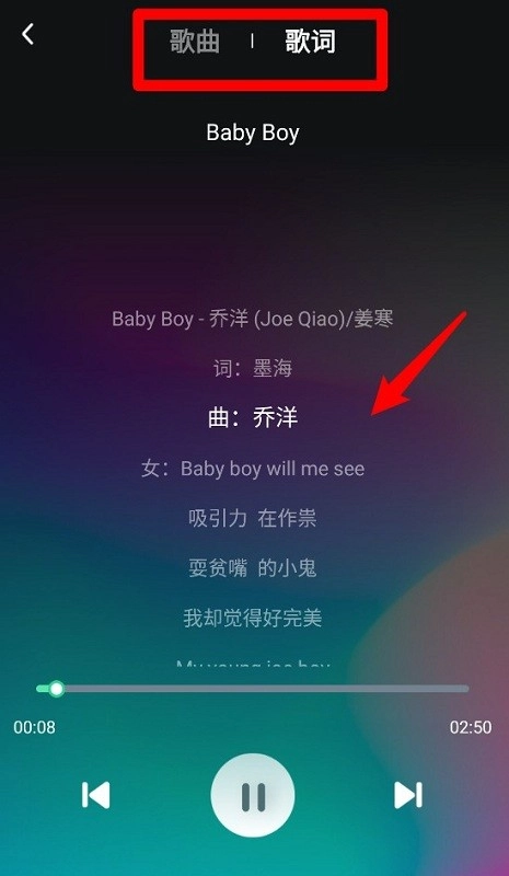 2.点击歌曲可以进入播放界面,支持歌词同步显示,还能查看词曲信息并控制播放进度。