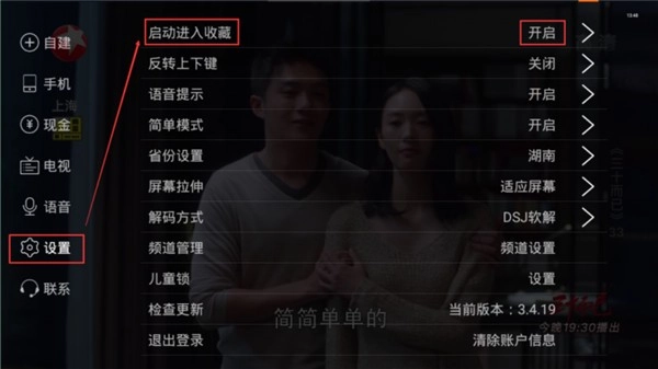 将所有喜欢的频道加入收藏列表之后,就可以设置开机自启了,在软件的“设置中心”里,选择将“启动进入收藏”设为“开启”,下一次打开电视家的时候,就会自动进入你的收藏列表了,是不是很简单呢。