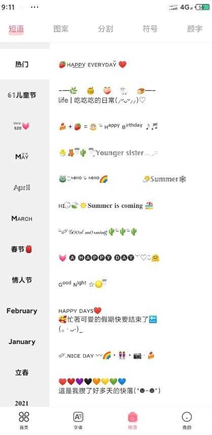 2、点击短语就可以看到很多可以直接使用的热门图案、短语、颜字以及符号等。