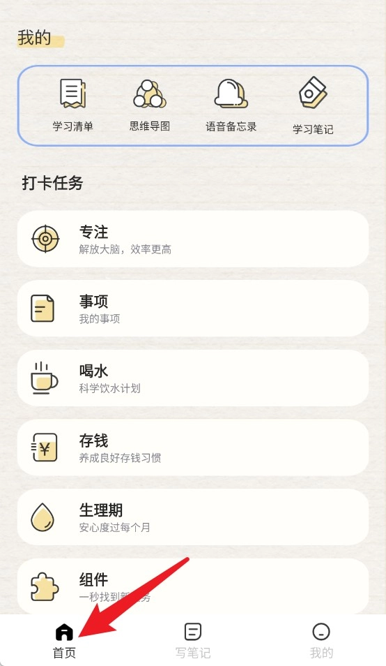 1、在首页可以查看学习清单、思维导图、语音记录等内容,同时还能完成喝水等多项打卡任务。