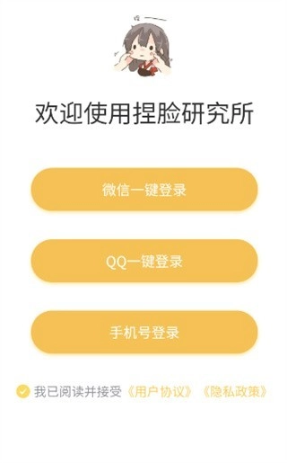 用户在使用捏脸研究所前,需先阅读并勾选用户协议与隐私政策,同时完成账号登录操作。
