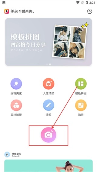1、在【美颜全能相机】的界面里,点击中间那个粉色的相机按钮,就能进入到拍照相关的流程中。