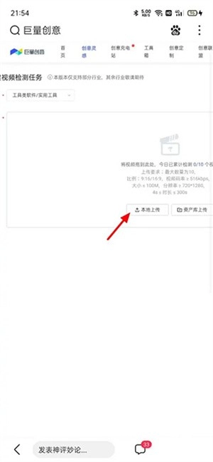 在创建页面,点击本地上传。