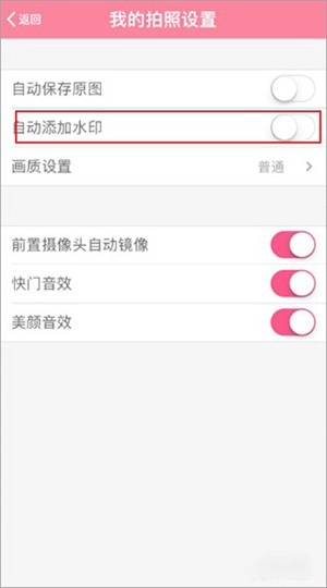 5、将设置栏中显示的自动添加水印按钮关掉后,拍出的照片上就没有水印了。