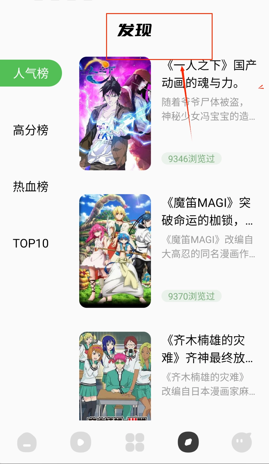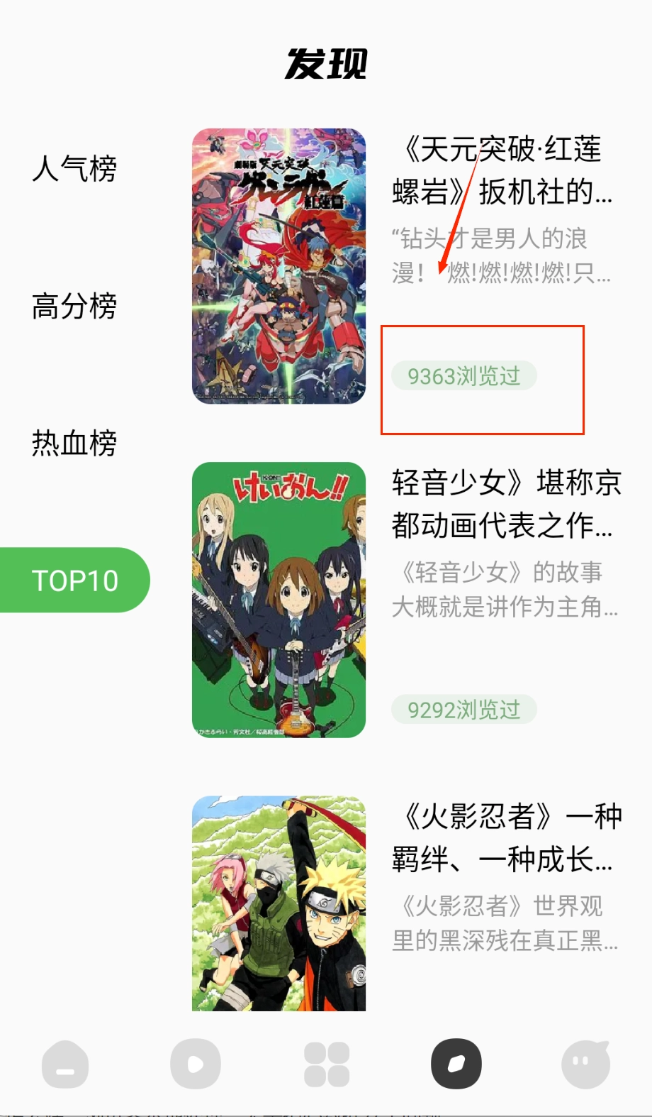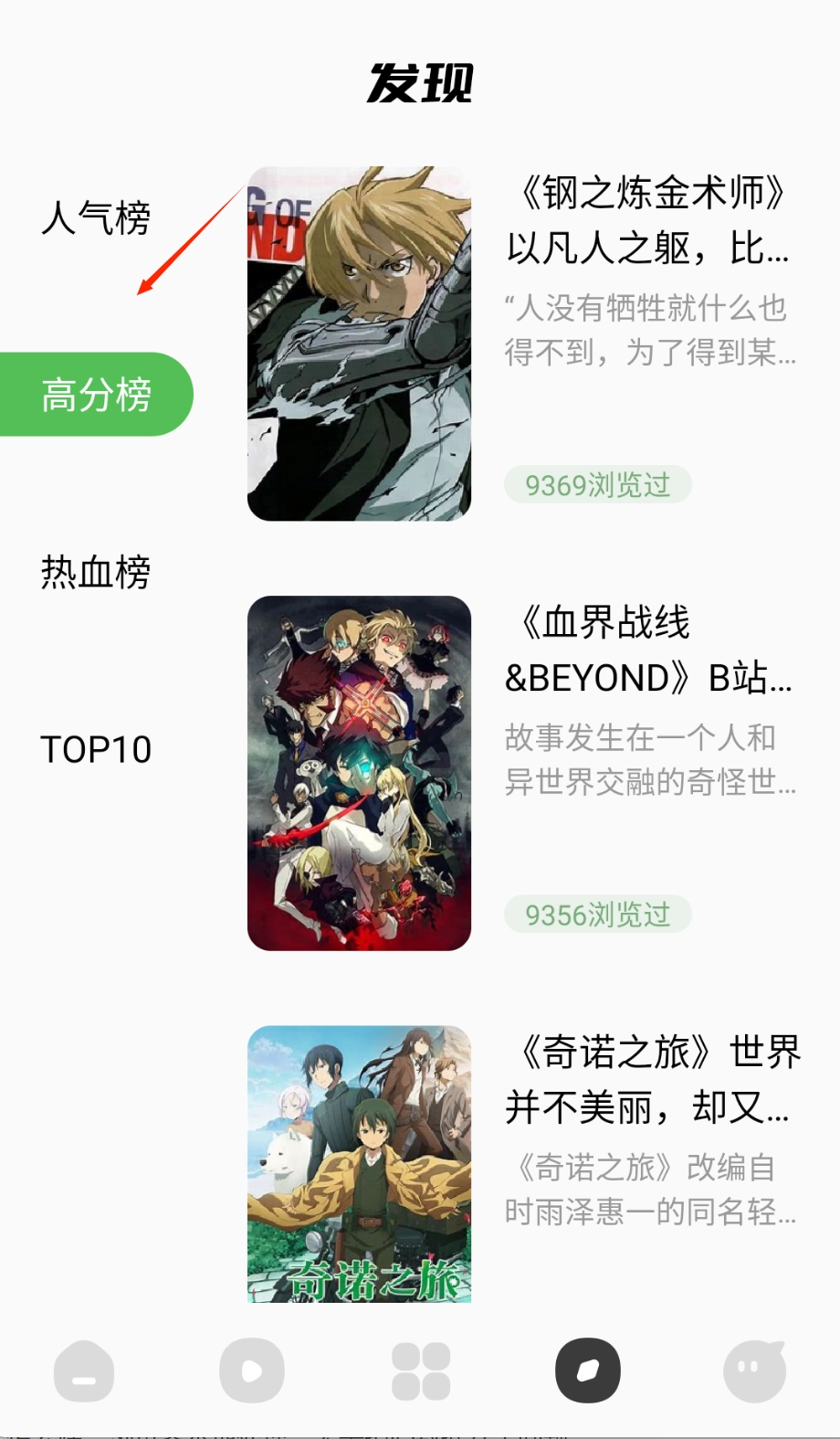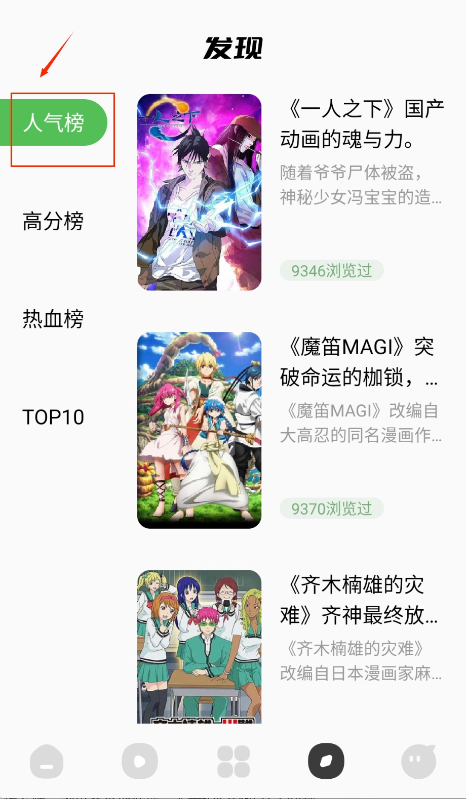 进入“发现”页面后,左侧显眼处整齐排列着四大榜单的入口,分别是人气榜、高分榜、热血榜与TOP10,每一个榜单均经过了细致的筛选。