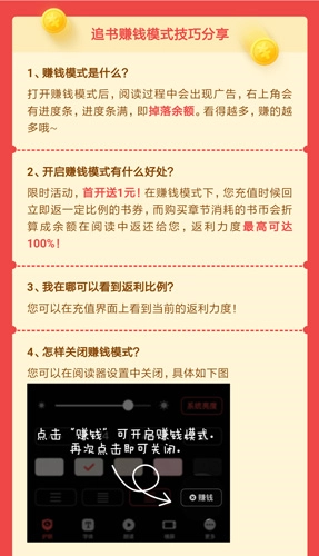 用户在阅读过程中将会出现广告,在每本书中右上角都会有进度条,进度条满,即掉落余额。看的越多,赚的越多。