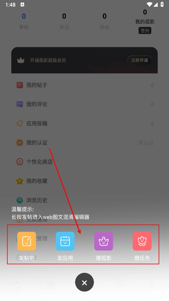 7、最后点击中间发布图标,还可以进行发帖、发应用、赚孤影等。