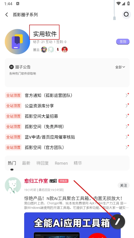 6、比如进入实用软件社区,点击右下角的发布图标就可以进行发布帖子。