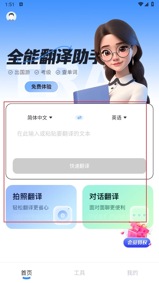 2、进入首页,支持输入文本翻译、拍照翻译和对话翻译。