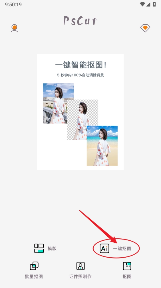 1、启动PS抠图软件,进入主界面后,点击“一键抠图”功能按钮。
