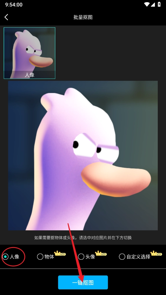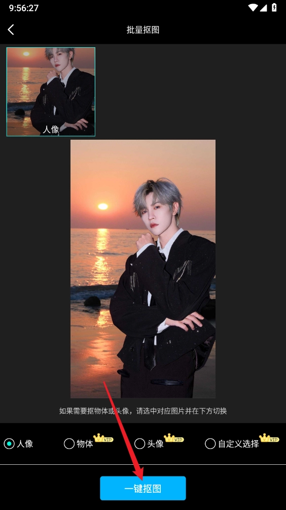 2、上传所需抠图的图标,勾选人像,点击"一键抠图"。