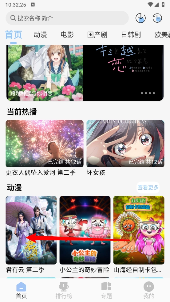 2、进入首页,直接搜索或滑动选择所需投屏的动漫资源。