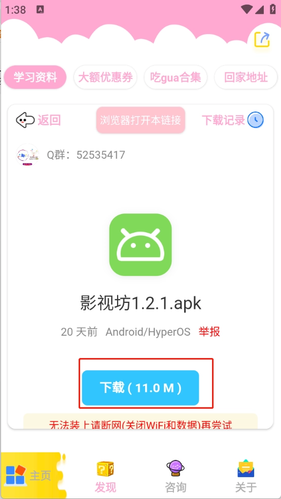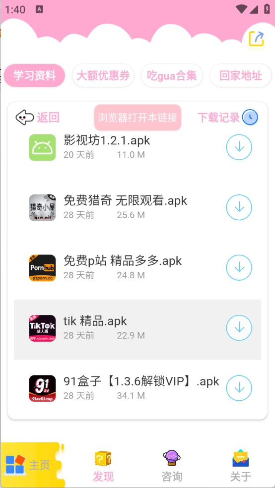 3、“发现”页面,将软件资源进行了详细的归类,包含了影视类、小说类以及漫画类等。