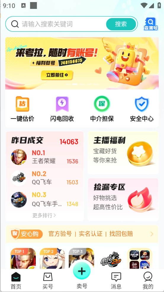 2、进入到首页之后,为用户推荐了当前热门的游戏账号资源。