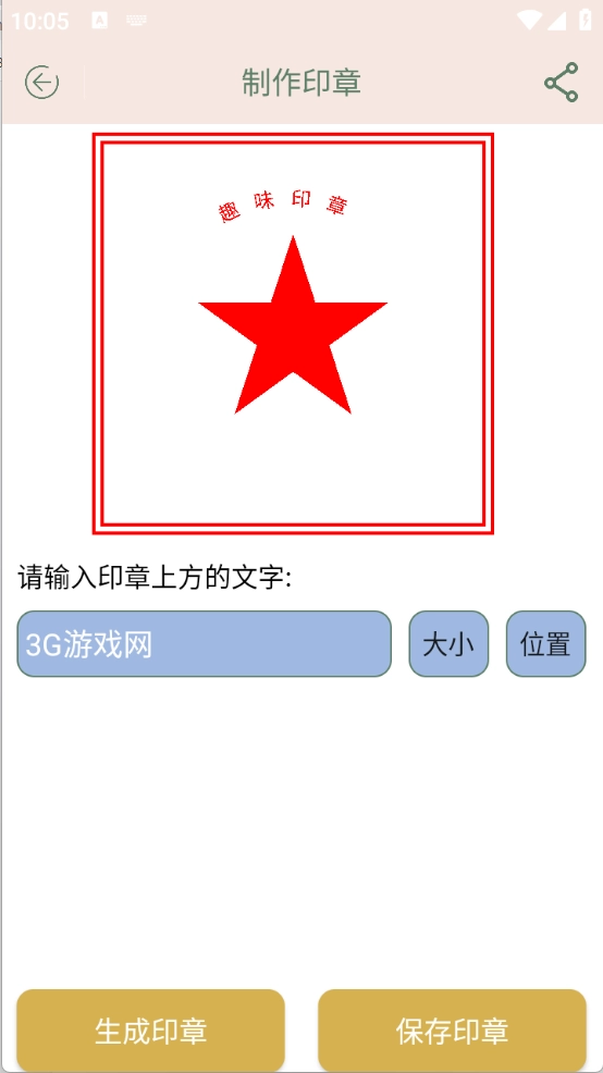 趣味印章是一款能生成趣味营印章的实用工具,提供多种印章样式供选择。只需输入文字,调整印章的大小与位置,就能完成制作。制作好的印章可以保存下来,用途广泛,比如给图片和视频添加水印,或是在笔记本上做标记等,十分方便好用。