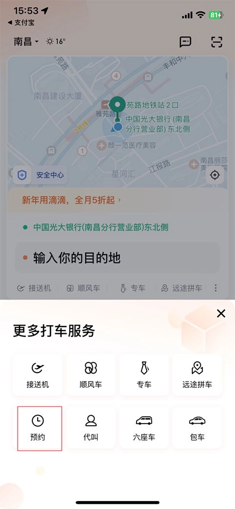 1、在本站打开滴滴出行,登录账号后返回首页,点击下图所示位置的预约选项